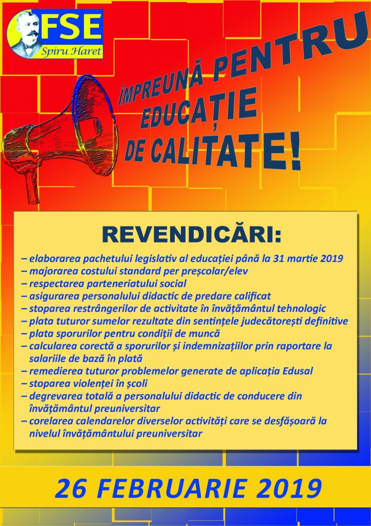 Printre revendicările Federației Sindicatelor din Educație „SPIRU HARET“ se numără: